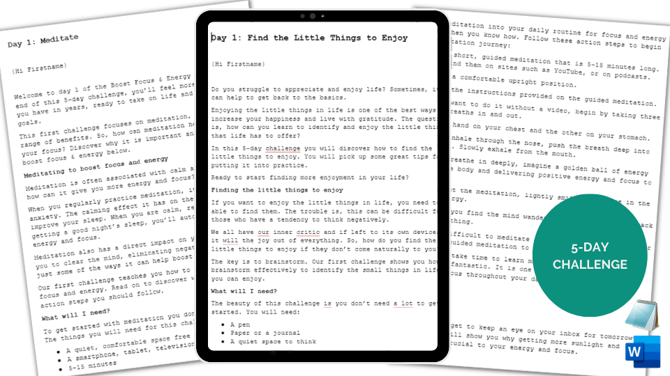 - 5-DAY CHALLENGE - Easily set this up in your email software system so that people can sign up for free or use it as a paid challenge.
