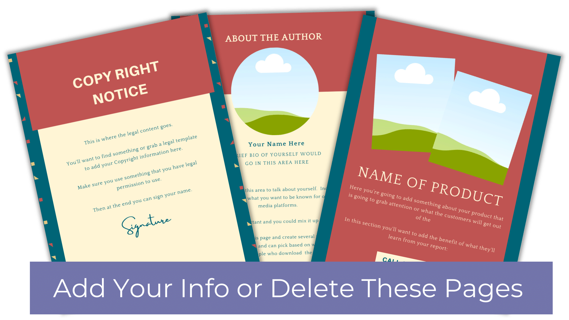 Inside the Canva eBook Template, you'll notice three pages where you can add your own information. These include the Copyright page, the author page, and a call to action page. If you don't want to use these - make sure you delete them before you create a PDF for your audience.